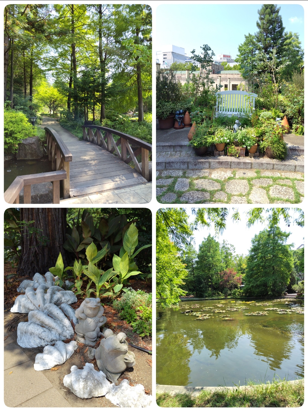 平日の午後ということもあり、人は少なくて静かな雰囲気。緑が多くお花がたくさん咲いて、池はキラキラ✨と眩しく、癒やしの空間でした。